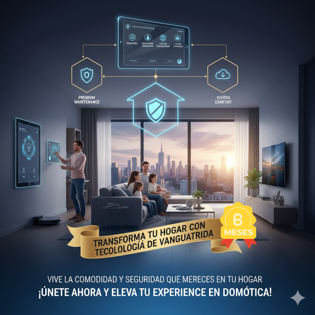 Disfruta de servicios exclusivos, con mantenimiento prémium, monitoreo continuo, visitas personalizadas y descuentos especiales, transforma tu hogar con tecnología de vanguardia. Vive la comodidad y seguridad que mereces en tu hogar. ¡Únete ahora y eleva tu experiencia en domótica!
